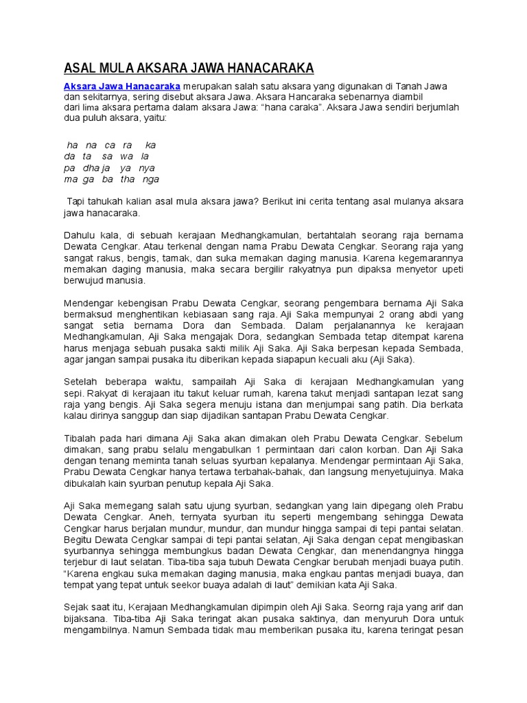 Kumpulan Cerita Berbahasa Jawa Kumpulan dongeng bahasa jawa legenda bahasa jawa cerita rakyat bahasa jawa cerita wayang dalam bahasa jawa pidato bahasa jawa Tulisan Aksara Jawa dan Pasangannya Buat para sahabat yang sedang mencari tulisan aksara jawa dan pasangannya. Akan tetapi penafsiran lain beranggapan bahwa kata Saka adalah berasal dari istilah dalam Bahasa Jawa saka atau soko yang berarti penting pangkal atau asal-mula maka namanya bermakna raja asal-mula atau raja pertama. Dalam artikel ini saya akan sedikit membahas tentang salah satu aksara yang.